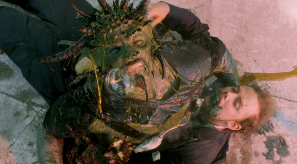 Thus begins the fifth and final level of doom – “Mind.” Toxie starts to melt and form squirting boils all over his body and face. He oozes green goop all over the place, effectively melting into nothingness. Again, say what you will about this third movie, and I will have more to say shortly, but I cannot argue with the craftsmanship of some of the stuff, like the Devil emerging from the Chairman’s body or a melting Toxic Avenger. This is good-looking stuff.