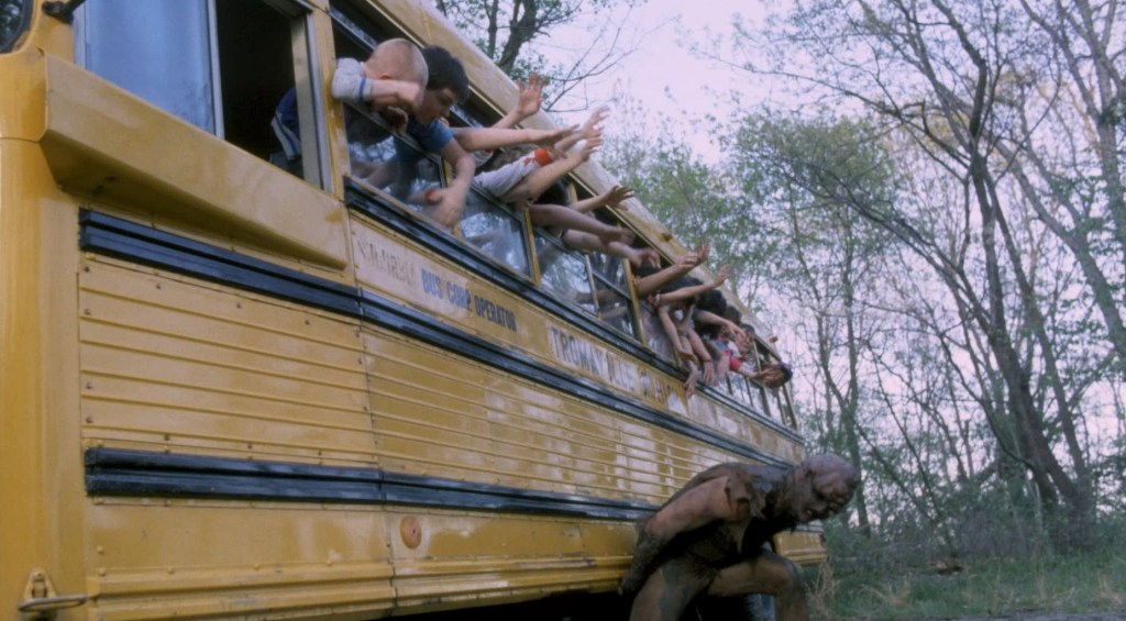 The plan for this round is to force Toxie onto the hood of the bus and drive him to the world-famous mud bog in Tromaville. When they land in the bog, the bus explodes, making everyone believe that Toxie has perished in the flames. Of course, Toxie’s still alive, and he flips his way out of the water. He tells us this is an old sumo trick whenever they’re plunged into a muddy pool of water.