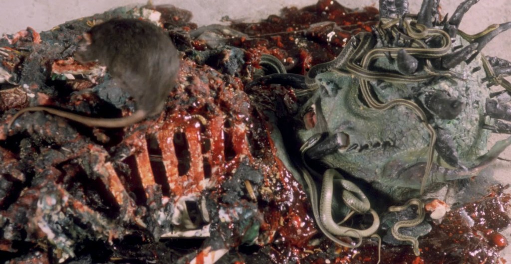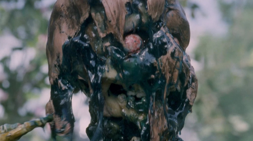 The Toxic Avenger kicks the Devil’s ass pretty easily from that point on, and tears his green, goopy skin off, rendering him only a skeleton with rotten insides and a head.