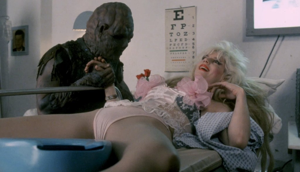 The Chairman of Apocalypse, Inc. hears from his underlings in a scene that I’m pretty sure is exactly the same one from Part II, but I digress. He says that since being defeated by the Toxic Avenger, Apocalypse, Inc. has been struggling. All these reports are fine or whatever, but what he really wants is the Toxic Avenger. His right-hand babe, Malfaire, suggests they get Toxie on their payroll. So the Chairman has an idea. Claire needs an eye operation. That’s the hook he can bait to get Toxie on their side.