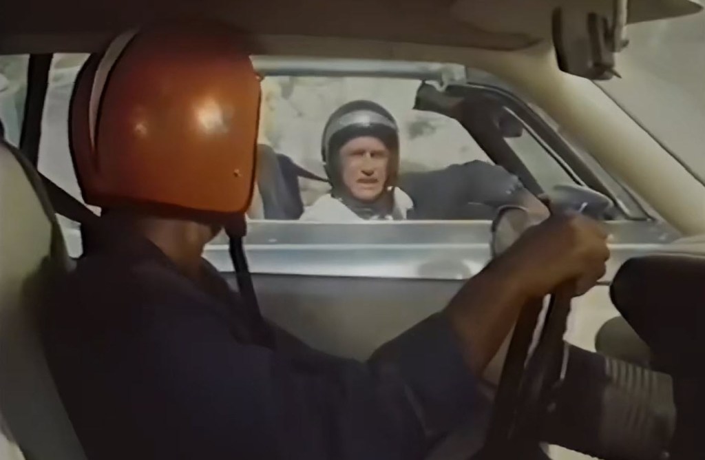 Darren McGavin, TV’s Kolchak, the Night Stalker, and probably best known to people my age as Ralphie’s gruff father in A Christmas Story, is Red. He owns a 1980 Pontiac Firebird and is a general car enthusiast. He is what’s called a “Burner,” someone who drives private vehicles. He has various other burners that he assists as they attempt to evade the DVC, short for the government’s Department of Vehicle Control. Now, maybe I’m being semantic or a bit pedantic, but wouldn’t the better term be the Department for Vehicle Control or the Department of Vehicular Control? Red and his burner friend are in cahoots with a Senator from California who is opposing the ban on personal use vehicles and the restriction of oil.