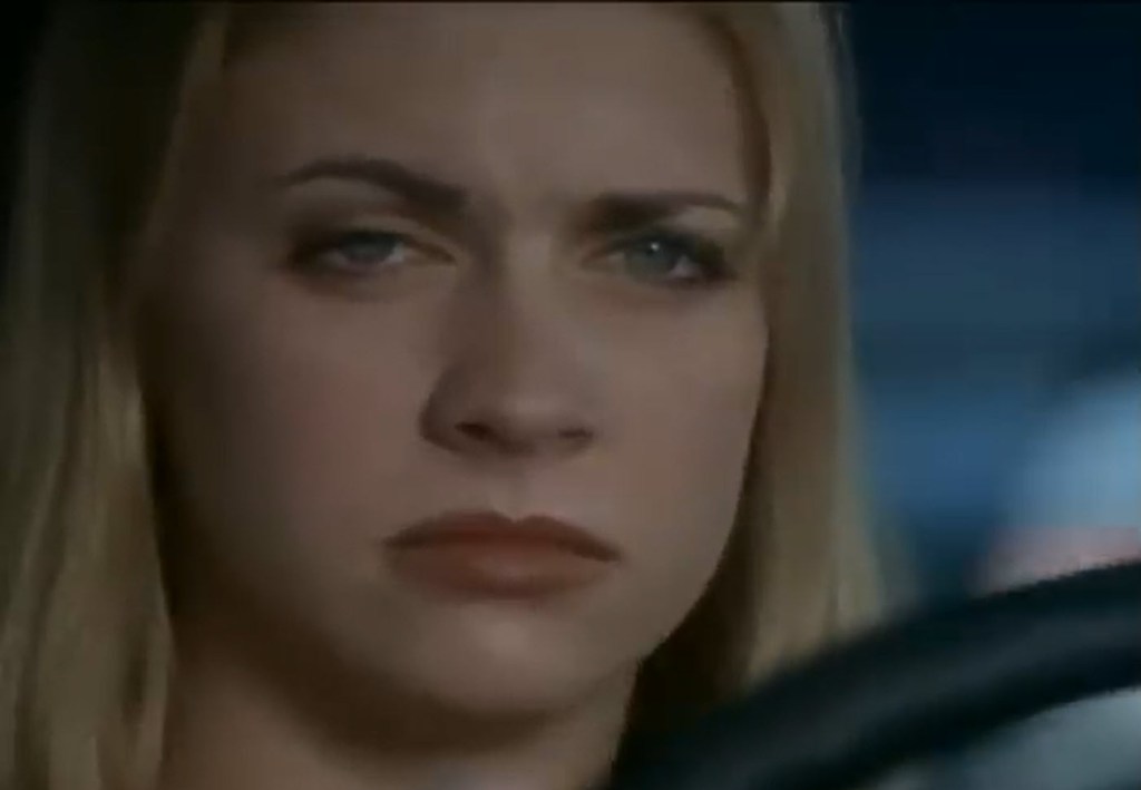 The next morning, Jennifer’s dad dislikes the clothes she decides to wear to school. This is largely a drab green cropped top that shows off her midriff. This was also peak 90s. Girls just showed their midriffs like that shit was going out of style. Actually, that’s not something that’s really gone out of style 30 years later. Anyway, he forces her to change her clothes, and she goes to pick up her friend, Karen. They stop at a gas station to fill up the car and for Jennifer to change back to her crop top.