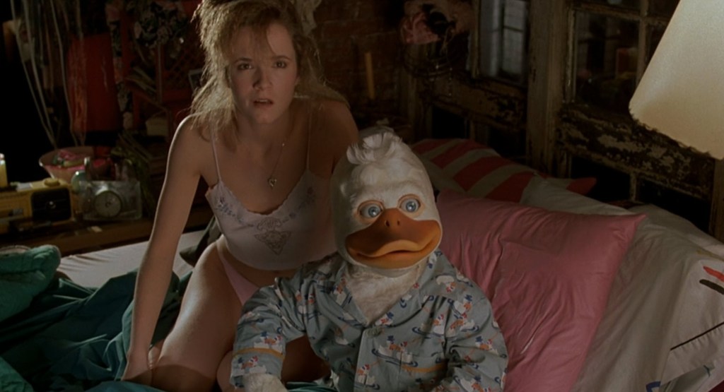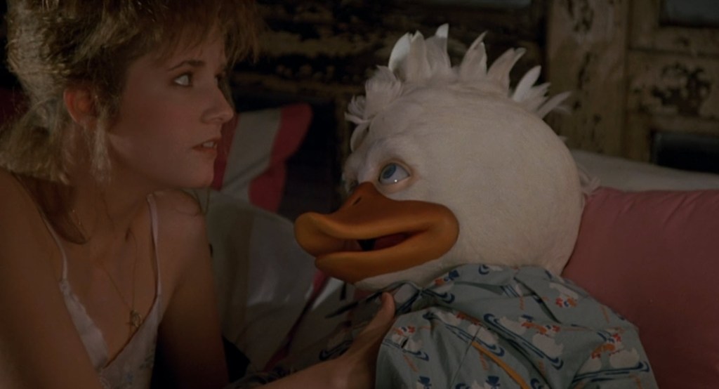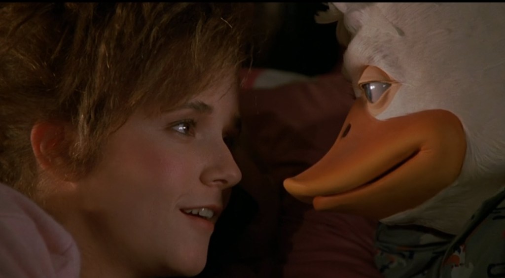 You know… You’re never quite ready for that moment when you’re watching a movie about a space duck that gets laid. Now, I admit… I don’t blame him for suggesting to Lea Thompson that they give it a go in the sex department. I mean… She’s really really pretty. Plus, she invites him to sleep in her bed and watch Letterman together. I’d be up for some cuddling and Letterman. Plus plus, Howard, like me, is only a male-type lifeform. Her sleeping attire is incredibly fetching. I don’t blame him at all for the suggestion.