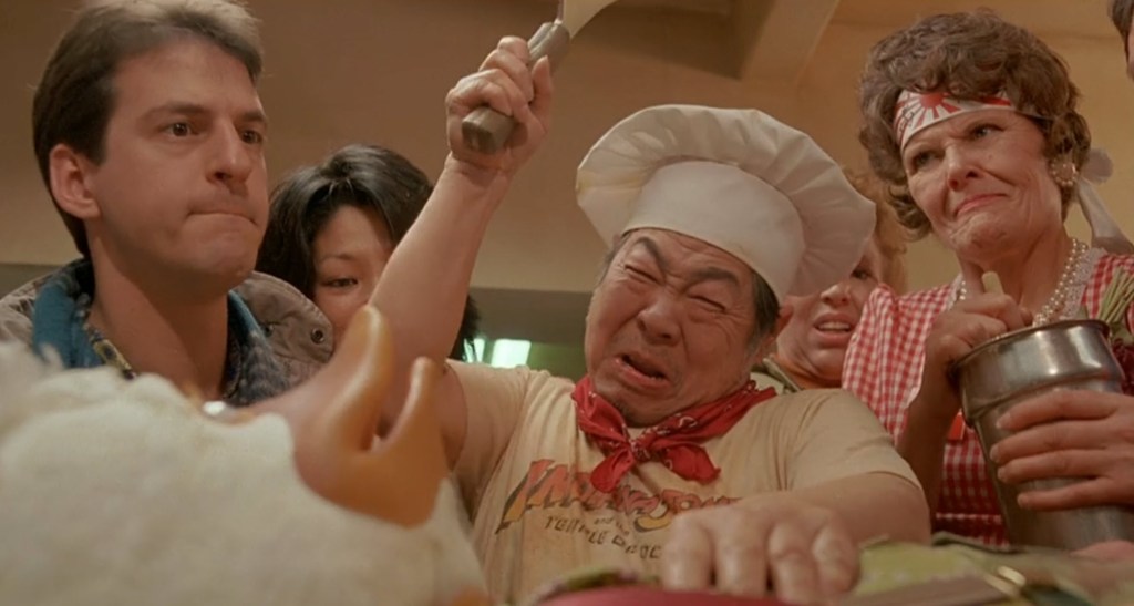 Yeah, I guess so. What’s more, I didn’t mention that this diner looks like Denny’s but serves sushi, so you’ve got this caricature in the kitchen. This is madness.