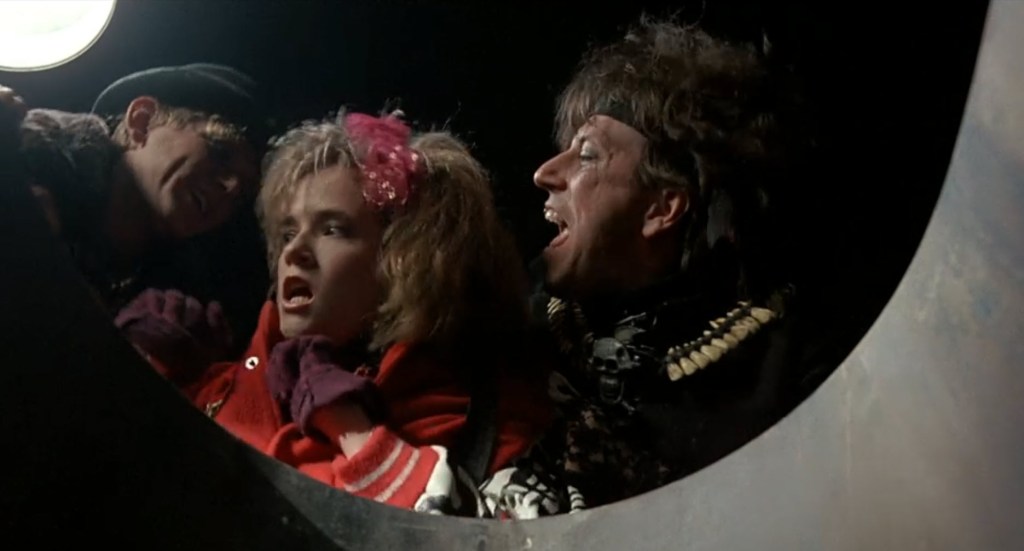 It is instantly a fucking nightmare… I mean, it’s Cleveland where he lands, so… Yeah, that lines up. He’s accosted by some punks who take him to a rock and roll club where Beverly (Lea Thompson) is performing with her band. They toss him out into the street, where he gropes a woman while she makes out with her boyfriend. He then gets tossed onto a motorcycle, which flings him into an alley. There, he climbs into a barrel and closes the lid for a nap.