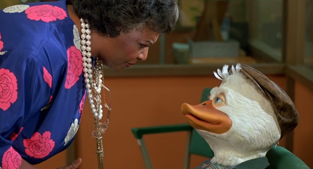 The job he is given is working odd jobs at a sex dungeon. No, I mean it. It’s a massage parlor/spa/sex dungeon. I think it’s a good idea to remind everyone that this is a PG-rated movie! Howard the Duck has already shown duck titties, parodied Playboy with Playduck, he wants to bite a black lady’s big ol’ butt, he works at a sex dungeon, and, before the end of the movie, a human woman will attempt to fuck him.