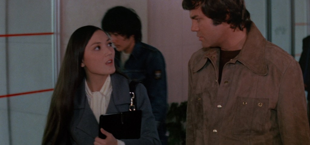 On the way out, he gets jumped by Lin To’s guys. However, a man and a woman, both of whom are pretty kick ass at the kung fu. The woman, specifically, is interested in going to Los Angeles with Dan. In fact, she has the plane seat next to him. She says that this is about acupuncture, but she still won’t share who she is with Dan. Now, this is Joe Don Baker, right? He’s not exactly gonna fully understand anything clandestine or be able to solve any riddles. He’ll largely do what he does when she keeps telling him that she won’t tell him who she is and give him off-the-wall clues about what it’s all about: look at her confused and say, “Huh?”