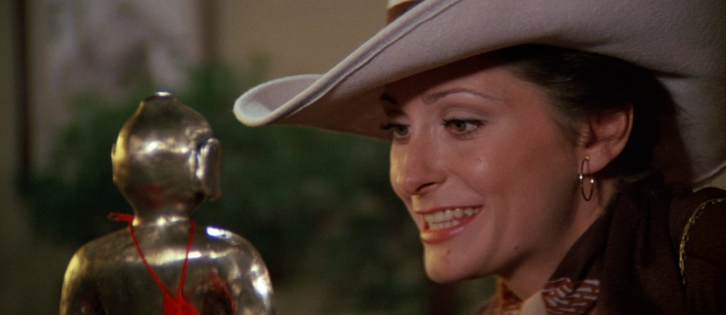 After he leaves, men in fireproof suits come in and torch that place to all fuckin’ hell. They torch the acupuncture table, the women who work there, the walls, everything. Now, the acupuncturist’s place might just be a smoldering pile of nothing, but the statue survived. And Elizabeth Ashley, definitely best known for playing Talia Shire’s lesbian stalker in Windows, is excited to see that it survived.