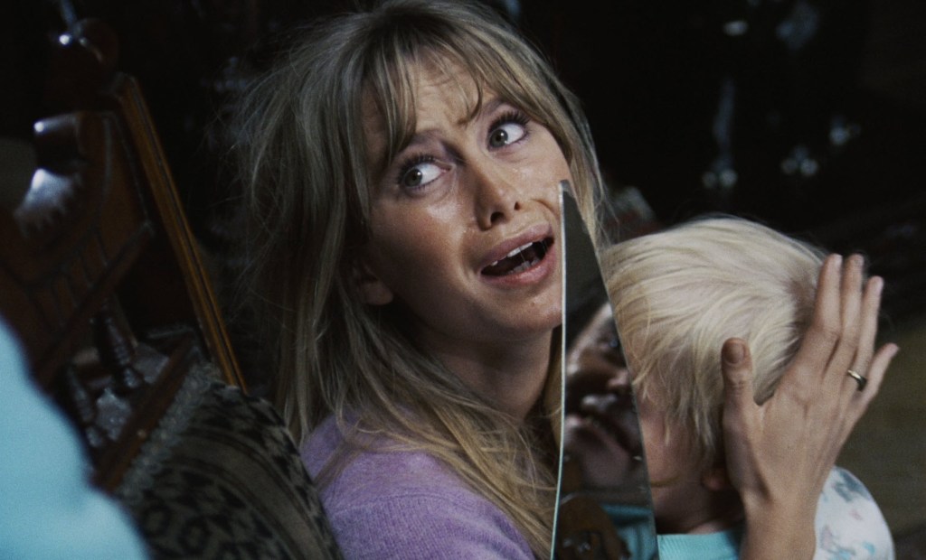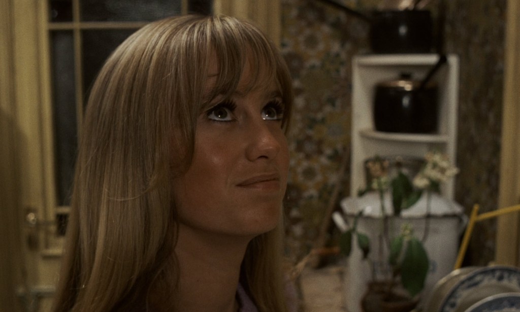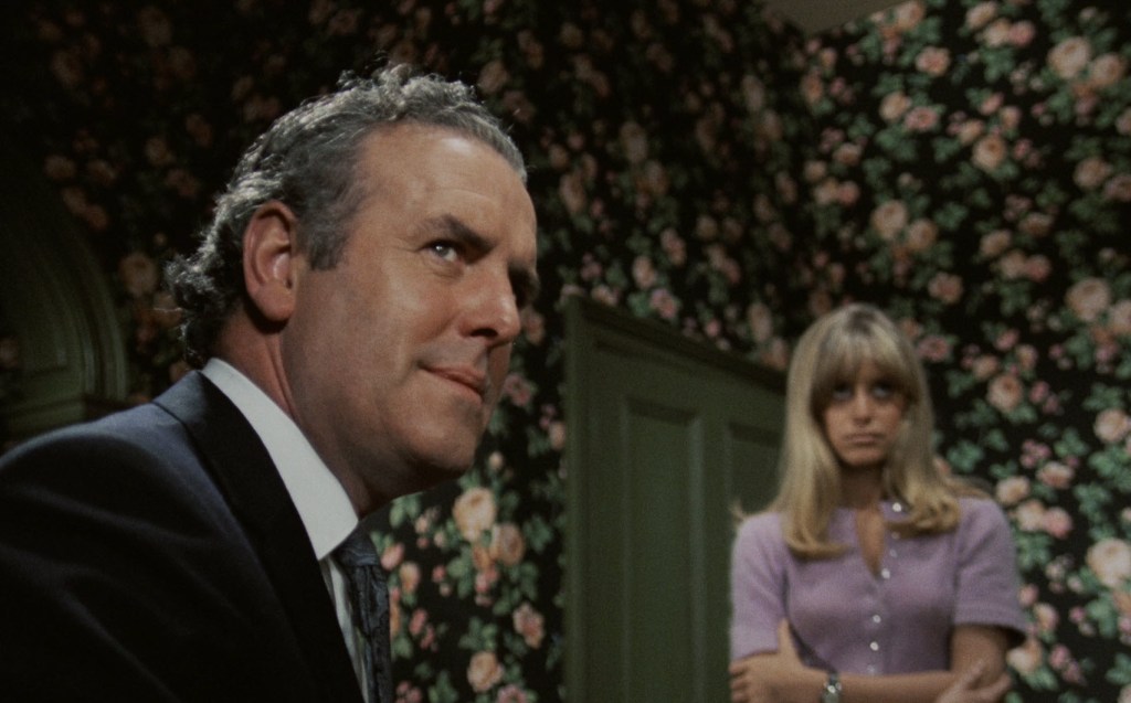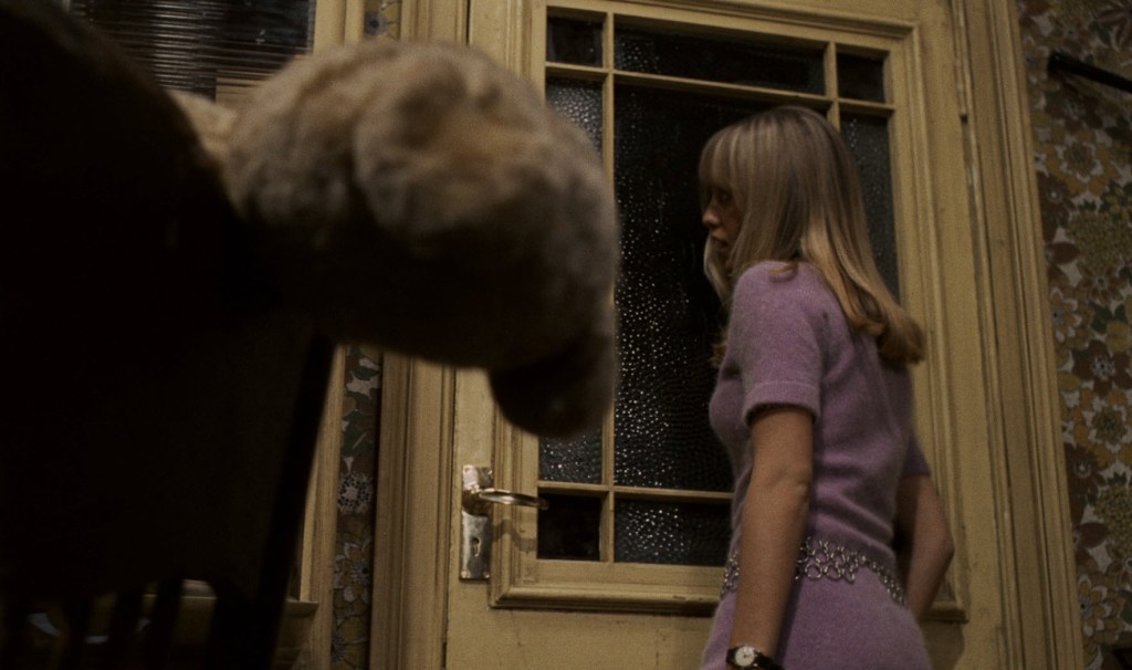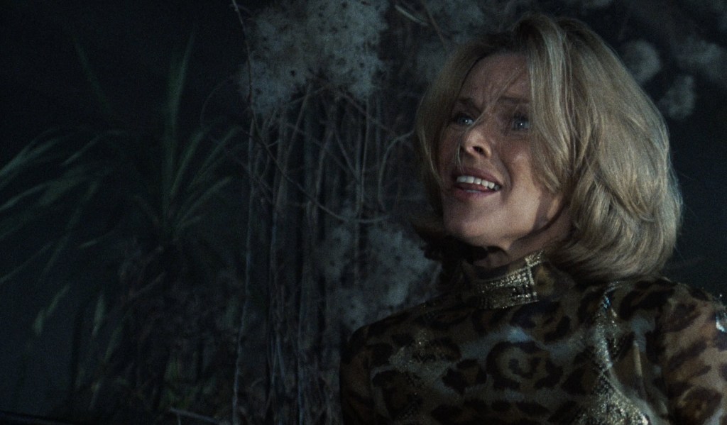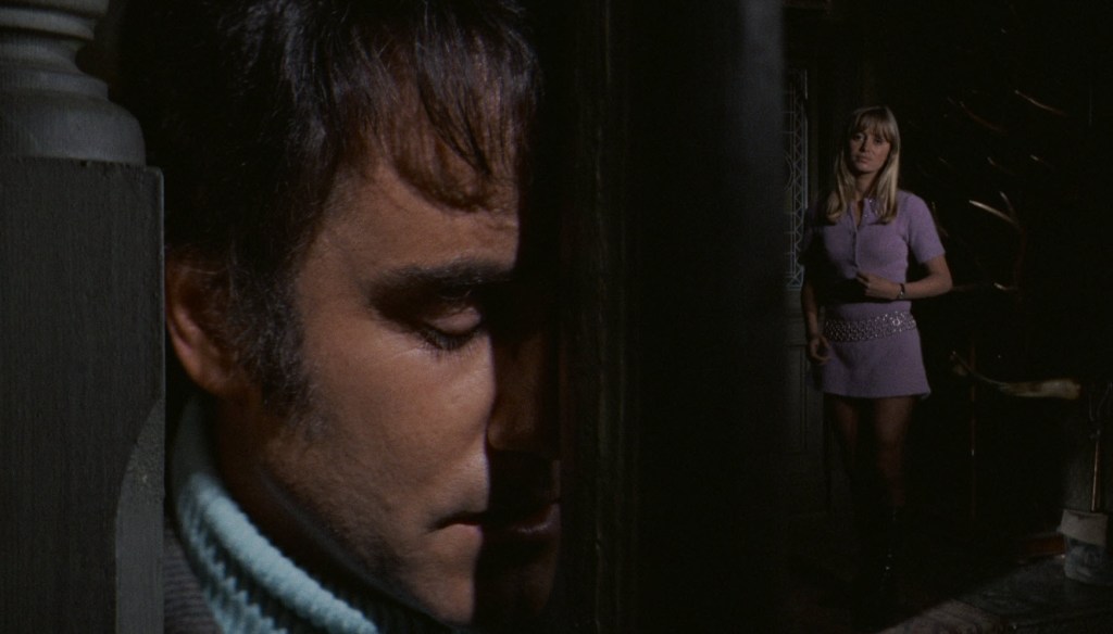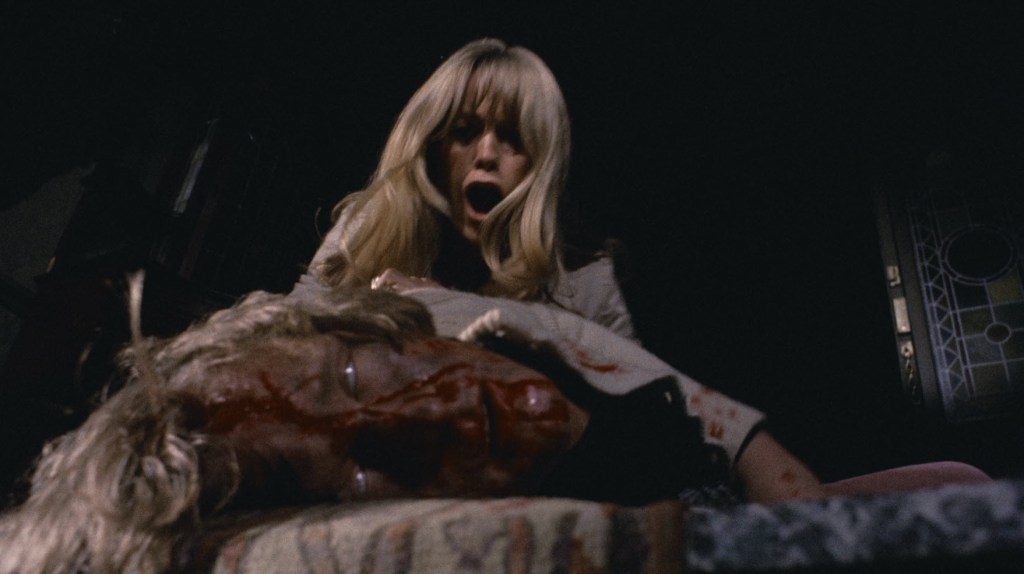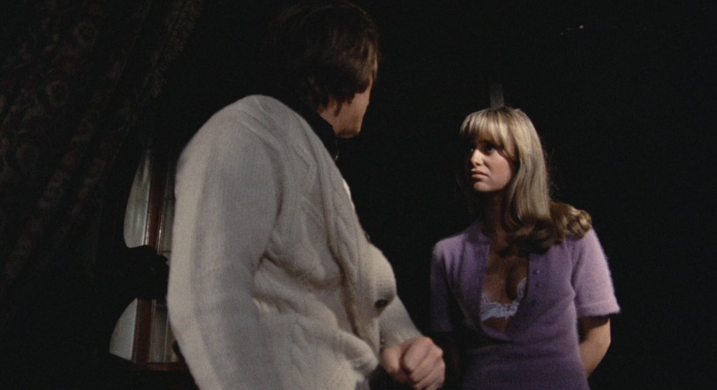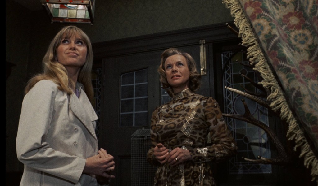We are introduced to a college girl named Amanda. She’s played by Susan George, who is having a fantastic 1971. She’s in this movie, Die Screaming, Marianne, and, maybe most notably, Straw Dogs with Dustin Hoffman. She arrives at the home of Helen and Jim Lloyd, a couple for whom she has been hired to babysit their child, Tara (actually a boy, not a girl), to make a little extra cash. If Helen Lloyd looks familiar, she should, especially to James Bond fans. That’s Honor Blackman, the all-time most memorable Bond Girl of them all – Pussy Galore.